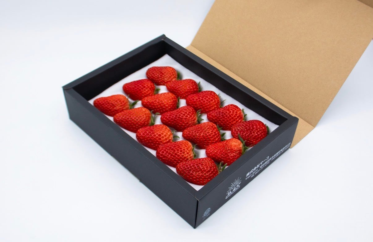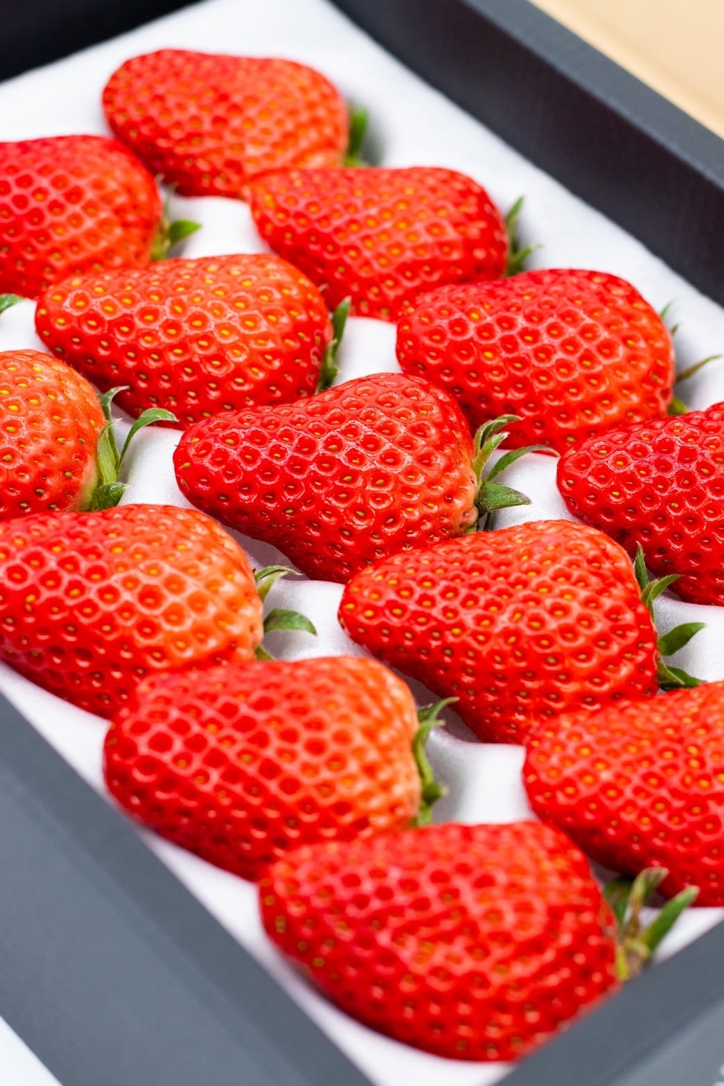 美しいいちご15粒を、まるで宝石のように特製の黒箱に並べてお届けします。